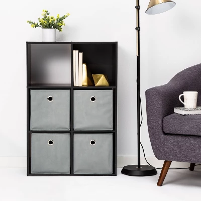 Stack away the extras out of sight in this 4-Pack of 11-Inch Fabric Bins Bundle from Room Essentialsā¢. Designed in a cube shape, this four pack of fabric bins easily fits in a cube shelf to help you save space and stay organized while storing your craft supplies, extra light bulbs, or other odds and ends. The round cutouts with silver-tone accents make the bins easy to pull out from the shelf. Lightweight and simple, this gray fabric bin bundle lends a sophisticated touch to your space. You can also place cube fabric bins throughout your home for pop-up storage, including on your desktop for office supplies or near your sofa to stash remotes and more.